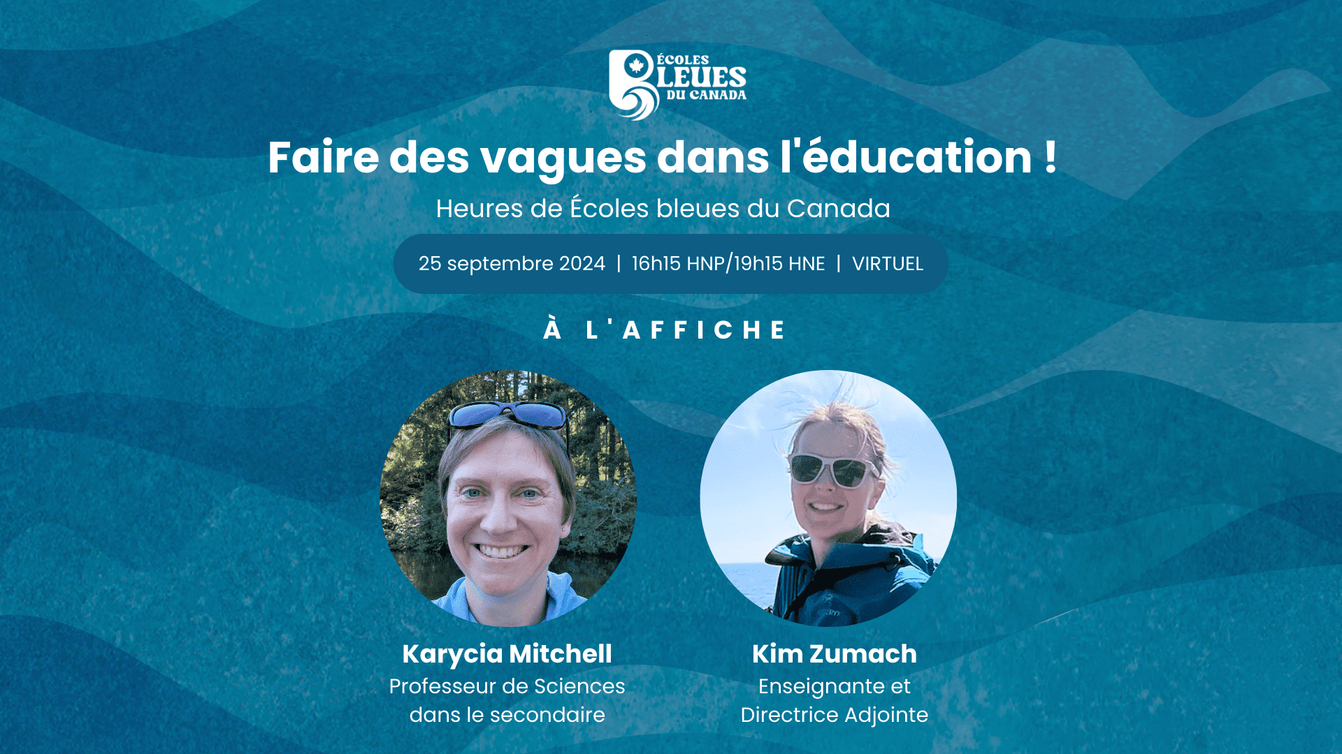 Bienvenue à tous ! Nous sommes ravis de commencer l’année scolaire en rendant hommage à deux enseignantes exceptionnelles. Ces éducateurs ont fait des progrès considérables en matière d’éducation sur les océans et l’eau douce grâce à notre programme de subventions Écoles bleues Canada. L’année dernière, des enseignants d’un bout à l’autre du pays ont présenté une demande de financement pour créer des expériences d’apprentissage attrayantes portant sur des enjeux locaux liés à l’eau. Joignez-vous à nous pour célébrer les réalisations de deux bénéficiaires de subventions lors de notre événement de lancement.